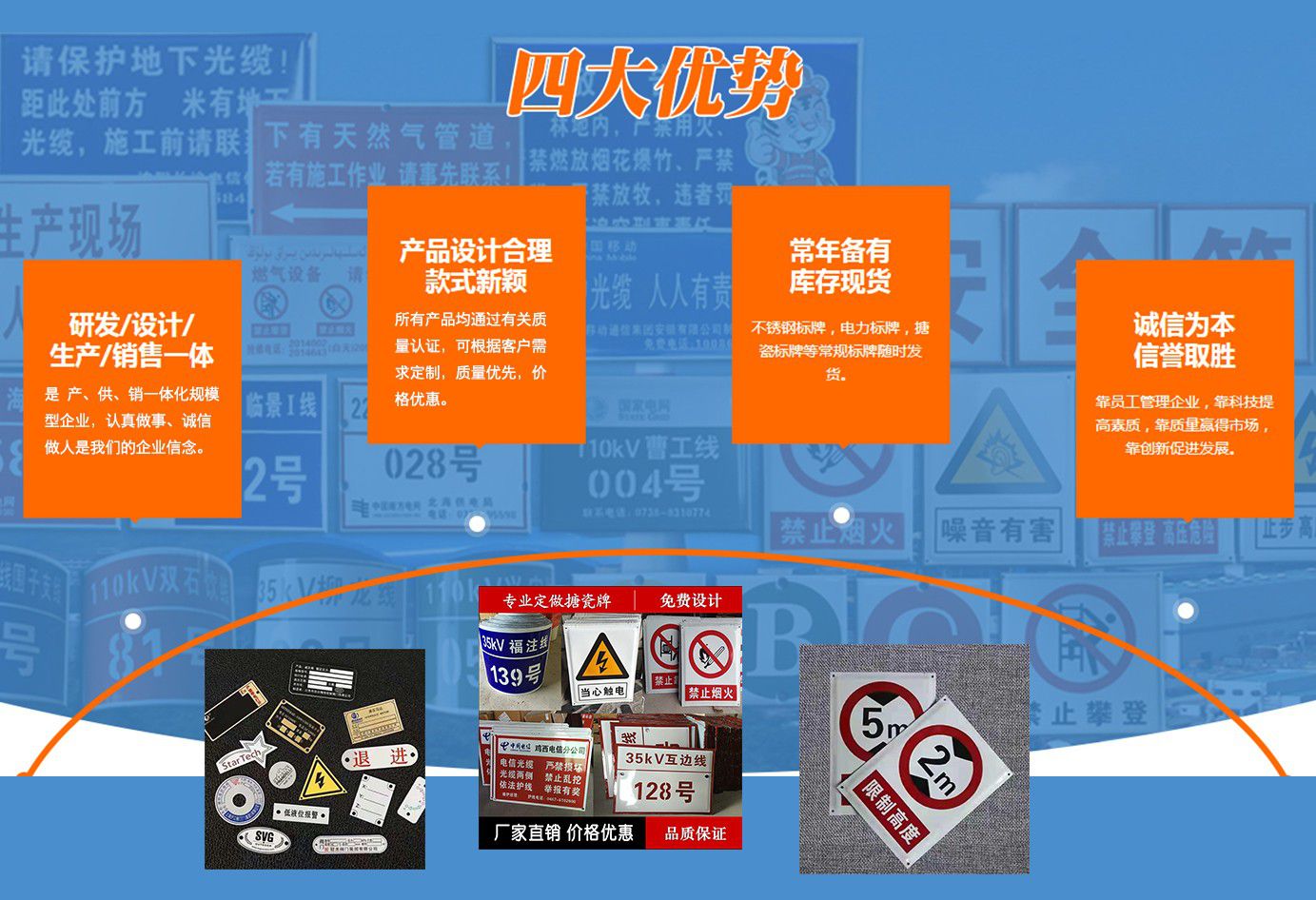 安徽峰銘標(biāo)牌有限公司成立于2018年,2020年成立峰銘標(biāo)牌山東分公司,是致力于標(biāo)牌生產(chǎn)研發(fā)的專(zhuān)業(yè)企業(yè)。峰銘標(biāo)牌多年來(lái)一直專(zhuān)注于標(biāo)牌及印刷事業(yè),擁有完善的生產(chǎn)技術(shù)和先進(jìn)的生產(chǎn)設(shè)備,有多名金屬科研單位和標(biāo)牌專(zhuān)業(yè)、標(biāo)牌企業(yè)從業(yè)經(jīng)歷人才,是專(zhuān)注于標(biāo)牌標(biāo)識(shí)及印刷品生產(chǎn)的專(zhuān)業(yè)型企業(yè)。 公司主要產(chǎn)品:腐蝕標(biāo)牌,搪瓷標(biāo)牌,絲印標(biāo)牌,UV標(biāo)牌,反光標(biāo)牌,不銹鋼標(biāo)牌,鋁合金標(biāo)牌,PVC標(biāo)牌,亞克力標(biāo)牌,高光標(biāo)牌,堆金標(biāo)牌,烤漆標(biāo)牌,電力標(biāo)牌,電廠(chǎng)標(biāo)牌,電網(wǎng)標(biāo)牌,通信標(biāo)牌,安全警示牌,相序牌,塔號(hào)牌,桿號(hào)牌,刀閘牌,閥門(mén)牌,銘牌,面板牌。交通標(biāo)牌,交通標(biāo)志牌,高速路標(biāo)牌,道路標(biāo)牌,路名牌,限速牌,限高牌,三維立體軟標(biāo),熱轉(zhuǎn)印標(biāo)牌。地產(chǎn)標(biāo)牌,鋼廠(chǎng)標(biāo)牌,宣傳欄,精神堡壘,不銹鋼扎帶,廣告字,水晶字,沖孔字,彩頁(yè)畫(huà)冊(cè)、不干膠印刷等專(zhuān)業(yè)生產(chǎn)。 近年來(lái),我公司堅(jiān)持“科技興廠(chǎng)”的方針,引進(jìn)先進(jìn)的生產(chǎn)設(shè)備和技術(shù),嚴(yán)格執(zhí)行國(guó)家及行業(yè)標(biāo)準(zhǔn),專(zhuān)注同行加工業(yè)務(wù),與時(shí)俱進(jìn),打造出了一系列精美產(chǎn)品。我公司已通過(guò)ISO9001質(zhì)量管理體系認(rèn)證,我們將繼續(xù)貫徹“誠(chéng)信經(jīng)營(yíng)、保質(zhì)保量、交貨迅速”的方針為您提供更優(yōu)質(zhì)的服務(wù)。 目前我司和國(guó)內(nèi)較多大中型電廠(chǎng)、電力公司、鋼鐵企業(yè)、通信企業(yè)、車(chē)輛企業(yè)、公路交通、機(jī)電設(shè)備、廣告公司同行加工等形成了...